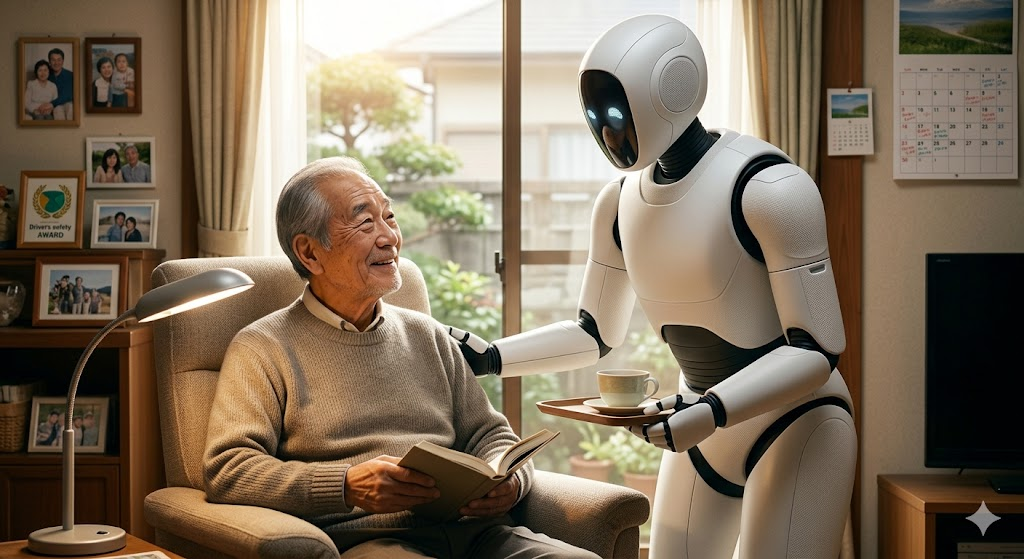 【画像の説明】 温かい自然光が差し込む自宅のリビングで、73歳の男性がくつろいでいます。その傍らには、優しく、しかし確実にサポートするAI介護ロボットが立っています。男性は笑顔で、ロボットは男性のそばに寄り添い、信頼と共感があるような雰囲気です。ロボットのデザインは、人型で洗練されており、介護用に特化した優しいフォルムです。「月額5万円」という「現実的な選択肢」を反映し、過度に未来的すぎず、親しみやすいデザインになっています。この画像は、単なる「介護」ではなく、高齢者の「自立」を取り戻し、最期まで自宅で尊厳を持って暮らす未来を象徴しています。「私のトラックの助手席にも、一台欲しくなってしまいますね(笑)」
